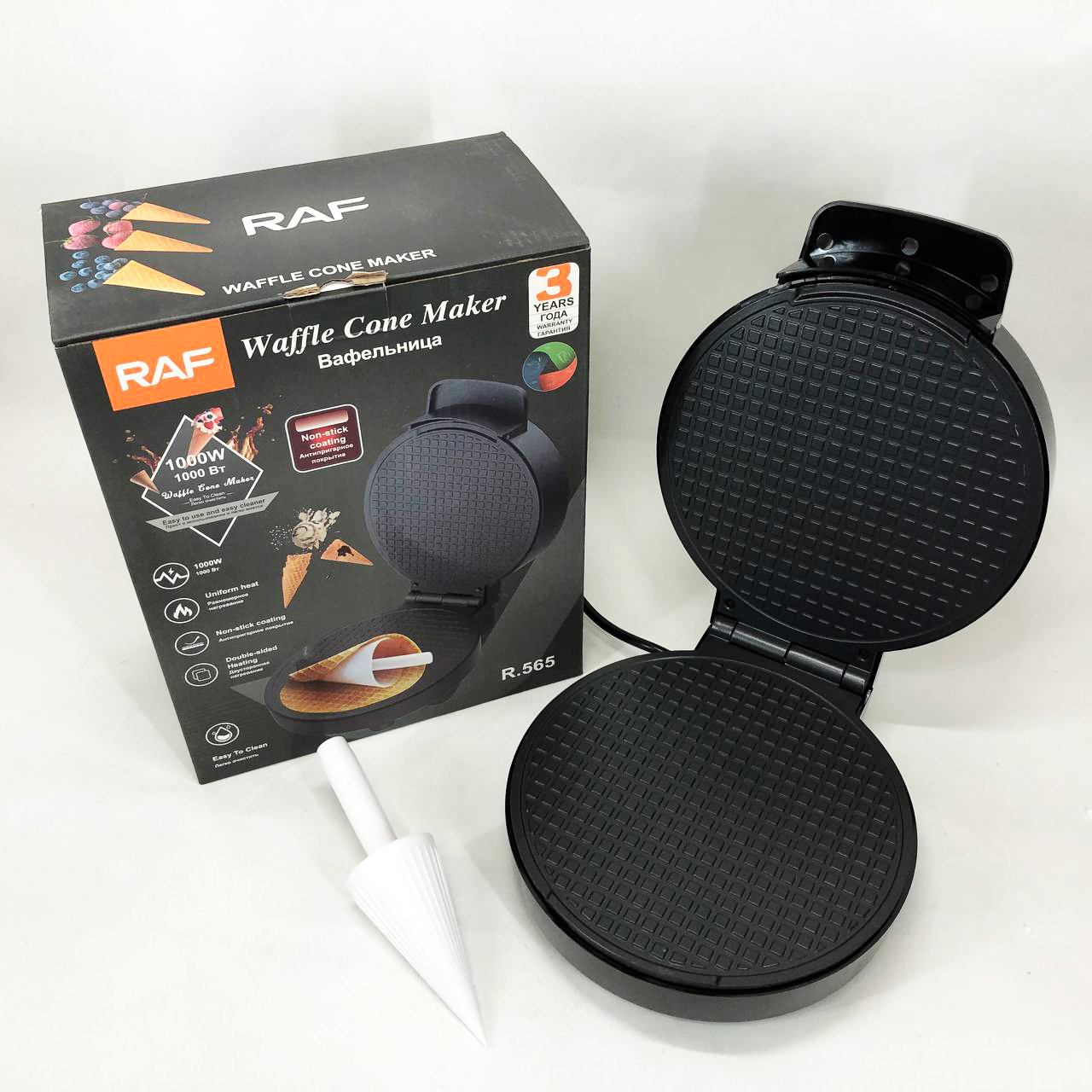 💡 Електрична вафельниця RAF R.565 з антипригарним покриттям і конусом для трубочок – Призначена для створення хрустких трубочок, які можна скласти в сендвіч, наповнивши їх фруктовою або кремовою начинкою. Робочі пластини з антипригарним покриттям рівномірно розподіляють температуру та якісно прожарюють вафлі з двох сторін.